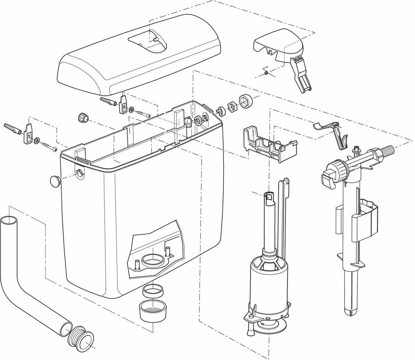 Na skici možete pronaći najčešće tražene rezervne dijelove donjeg vidljivog WC vodokotlića. Ako dio koji tražite nije dostupan, kontaktirajte nas i pokušat ćemo vam pomoći.